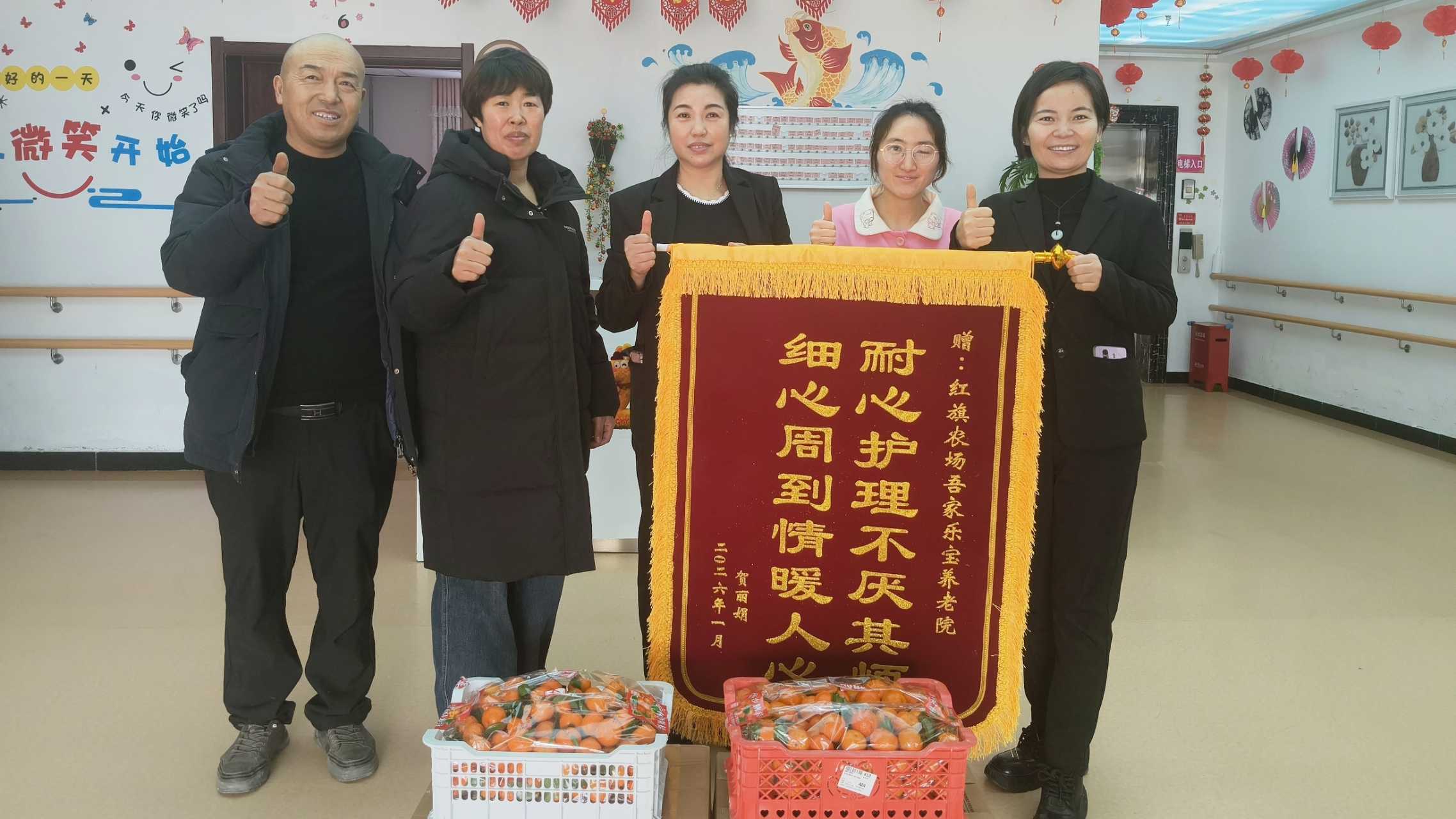 中國(guó)鐵路工程建設(shè)網(wǎng)訊(通訊員王蕊報(bào)道)2026年1月15日,新春將至的第六師紅旗農(nóng)場(chǎng)吾家樂(lè)寶養(yǎng)老院暖意融融。賀貴財(cái)老人的家屬專(zhuān)程趕來(lái),將一面飽含敬意的錦旗與兩份橘子、一件香蕉、一件蘋(píng)果等愛(ài)心水果,鄭重送到工作人員手中,用最質(zhì)樸的方式表達(dá)深切感念。