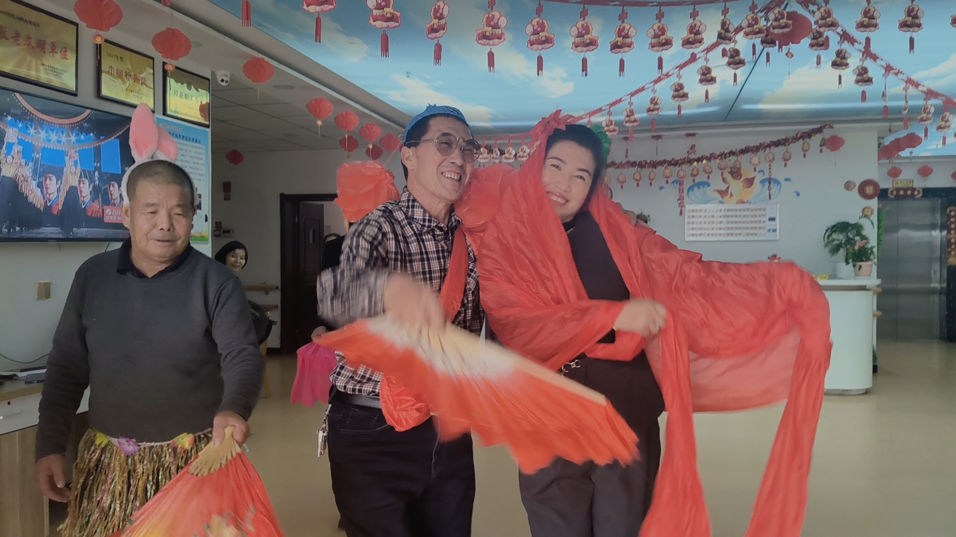 活動(dòng)現(xiàn)場(chǎng),喜慶的經(jīng)典民樂《抬花轎》率先奏響,明快歡騰的旋律瞬間點(diǎn)燃了全場(chǎng)氣氛。伴隨著這滿載吉祥寓意的節(jié)拍,由工作人員和志愿者組成的表演隊(duì)伍翩然入場(chǎng)。他們手執(zhí)絢麗的彩扇,舞動(dòng)火紅的綢帶,踏著傳統(tǒng)秧歌的步點(diǎn),在院中翩躚起舞。彩扇如繁花綻放,搖曳生姿;紅綢似霞光流轉(zhuǎn),飄逸靈動(dòng)。歡快的秧歌步伐與喜慶的音樂完美融合,構(gòu)成一幅生動(dòng)熱鬧的新春畫卷。