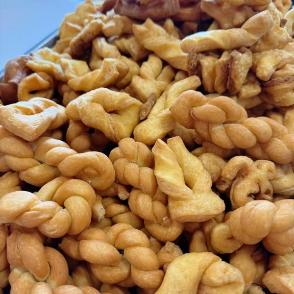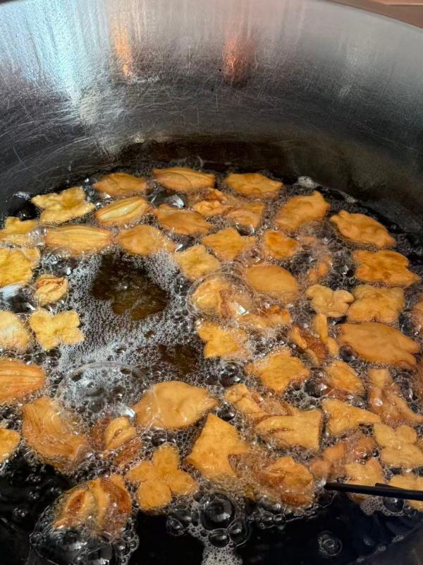 活動現(xiàn)場香氣滿滿、熱鬧溫馨。食堂精心準(zhǔn)備食材,專為長輩調(diào)配軟糯健康的配方,一起揉面、塑形、炸制,金黃的油果子、麻花陸續(xù)出鍋,香氣撲鼻。