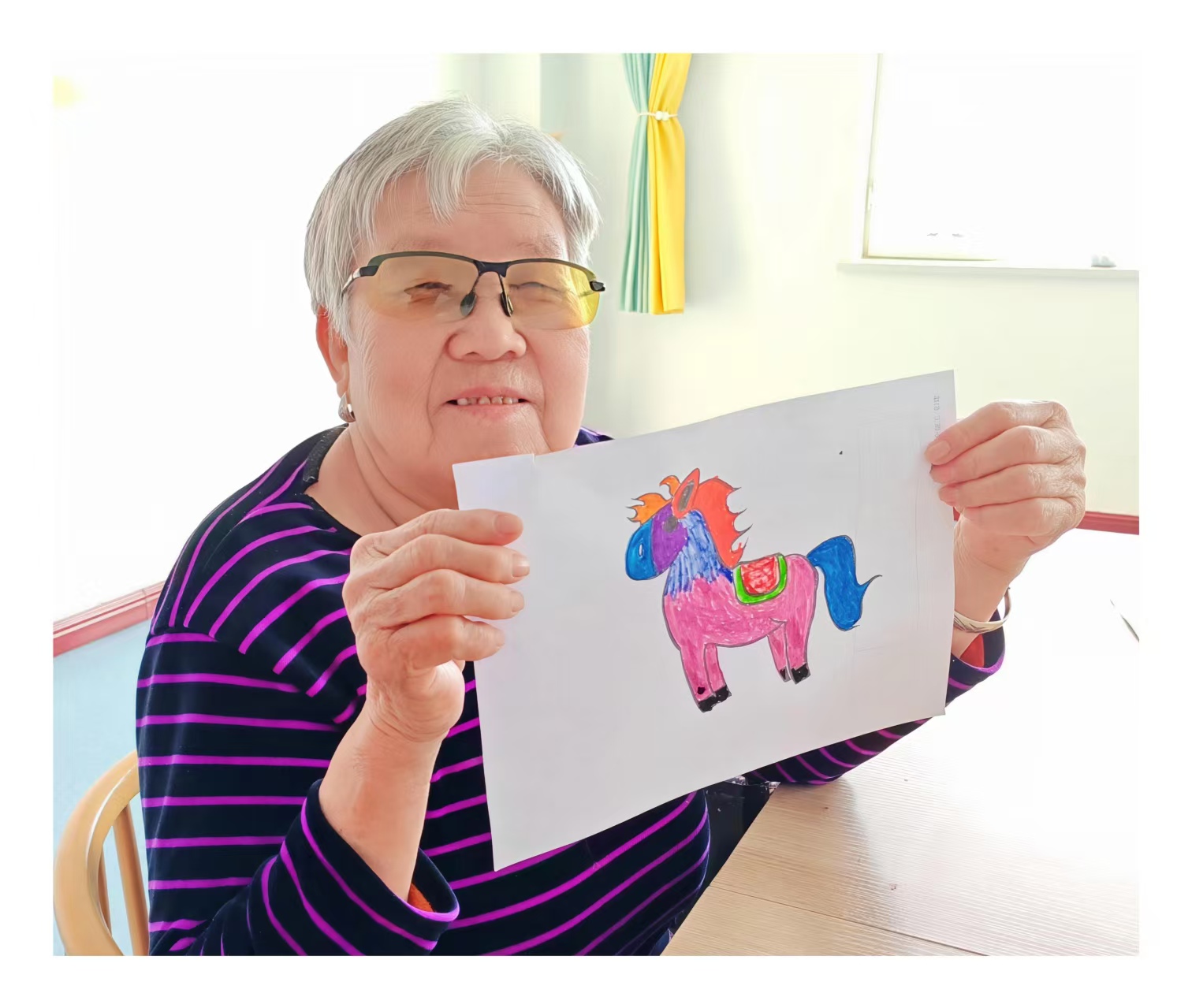 長者們興趣深厚,或揮筆勾勒駿馬輪廓,或細(xì)心描繪著色,神情專注而投入。筆下的祥駒有的神態(tài)各異,有的悠然佇立、神態(tài)溫婉,每一幅作品都飽含著長者們對生活的熱愛,也寄托著對馬年新春的美好期許——正如馬所象征的奮進(jìn)與吉祥,第六師奇臺農(nóng)場110社區(qū)吾家樂寶養(yǎng)老院的長者們雖已暮年,卻依舊熱愛生活,用彩筆畫出自己不老的情懷。
