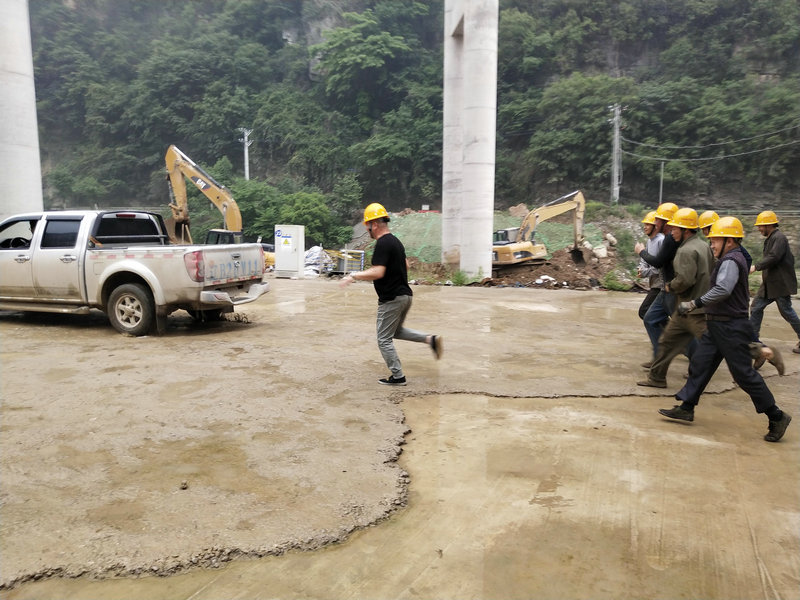 此次演練采用實(shí)戰(zhàn)演練方式,模擬霧渡河上游突降大雨,霧渡河水位報(bào)警裝置發(fā)出報(bào)警信息,水勢(shì)迅猛,危及項(xiàng)目施工現(xiàn)場(chǎng)。工區(qū)經(jīng)理高俊龍接到報(bào)警迅速發(fā)布撤離信息,安排預(yù)警監(jiān)控組人員迅速到沿河道往上游查看水情,并立即安排部署人員準(zhǔn)備沙袋,將沙袋堆放在廠區(qū)門口,安排挖機(jī)疏通河道,并準(zhǔn)備好應(yīng)急物資及應(yīng)急藥品。