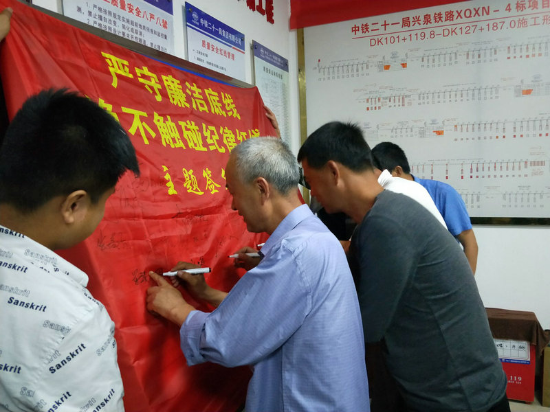 項(xiàng)目部全體干部職工在紅幅上簽下自己的名字,這不僅僅是一個(gè)名字,而是代表了一份承諾,一份對(duì)黨、對(duì)自己的承諾!