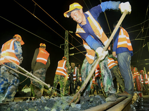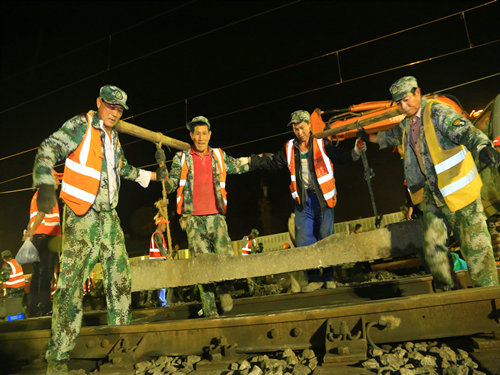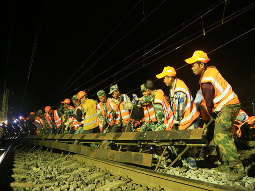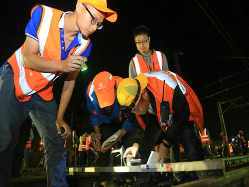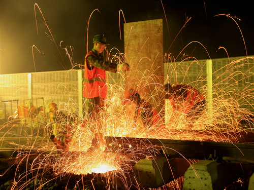 “調(diào)度命令已下達(dá),開始作業(yè)!”當(dāng)晚21時00分,施工負(fù)責(zé)人一聲令下,準(zhǔn)備多時的“鐵醫(yī)生”們?nèi)珉x弦之箭,迅速沖上線路,發(fā)動馬達(dá)、拆卸夾板,安裝切軌機......一時間,指揮聲、吶喊聲、機器轟鳴聲頓時響徹整個施工現(xiàn)場。