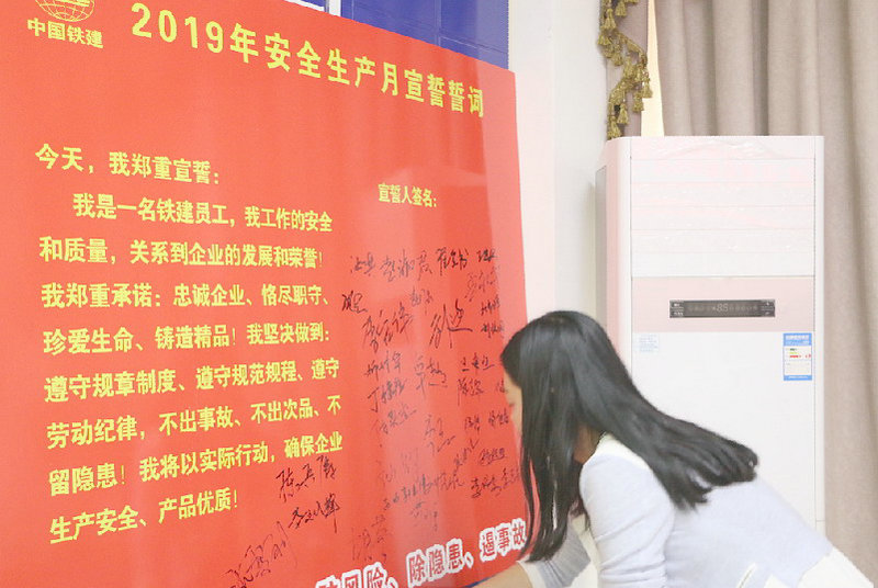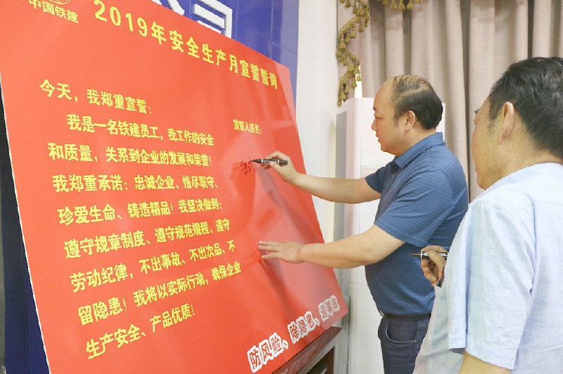 各分部經(jīng)理、書記、架子隊長及技術(shù)主管,分別就落實好“安全生產(chǎn)月”活動的管理措施,作了表態(tài)發(fā)言。全體參會人員進行了安全宣誓,并在“安全生產(chǎn)月”誓言版上鄭重簽下了自己的名字。這也意味著從那一刻起,他們每個人都把安全生產(chǎn)的責任寫進了心中、扛在了肩上。