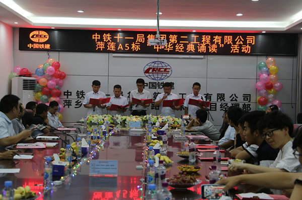 “高揚(yáng)共青團(tuán)的旗幟,昂首闊步,邁進(jìn)新輝煌,青春心向黨,建功新時(shí)代……”中鐵十一局二公司萍蓮高速A5項(xiàng)目團(tuán)支部的小伙伴們,用豪邁的《筑夢(mèng)萍蓮 青春A5》,抒發(fā)了對(duì)愛(ài)國(guó)主義精神的感懷。這是6月6日,萍蓮高速A5項(xiàng)目部“我們的節(jié)日·端午”經(jīng)典誦讀活動(dòng)的現(xiàn)場(chǎng)。