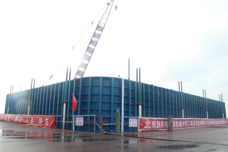 福廈鐵路7標安海灣特大橋177#主墩鋼——混組合吊箱成功下放