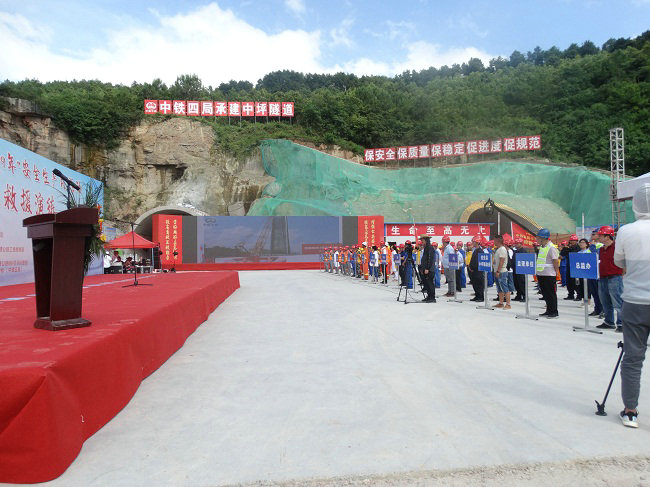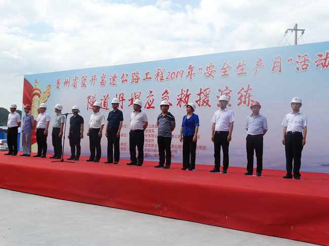 甕開(kāi)高速公路中坪隧道左右雙向全長(zhǎng)1295m,位于甕安縣中坪鎮(zhèn)境內(nèi),隧道穿越中風(fēng)化、強(qiáng)風(fēng)化白云巖,3—5級(jí)圍巖,圍巖破碎、節(jié)理裂隙發(fā)育,施工安全風(fēng)險(xiǎn)高,屬控制性重點(diǎn)隧道工程。隧道最大埋深約為130m,目前隧道雙幅已開(kāi)挖700余m。下午16:00,隨著現(xiàn)場(chǎng)貴州甕開(kāi)高速公路發(fā)展有限公司總經(jīng)理湯振山宣布演練正式開(kāi)始,演練場(chǎng)景假設(shè)在隧道左幅出口掌子面鉆爆作業(yè),突然在距掌子面10米處拱頂發(fā)生坍塌,洞內(nèi)填充物及周邊碎石約200方坍方體,現(xiàn)場(chǎng)安全員與值班領(lǐng)導(dǎo)經(jīng)清點(diǎn)人數(shù),發(fā)現(xiàn)1人輕傷、2人下落不明后,立即向項(xiàng)目經(jīng)理后,及時(shí)匯報(bào)應(yīng)急救援臨時(shí)指揮部,啟動(dòng)應(yīng)急預(yù)案,幾支救援隊(duì)伍按照臨時(shí)指揮部統(tǒng)一調(diào)度,整個(gè)救援演練經(jīng)過(guò)1時(shí)的過(guò)程有條不紊,實(shí)施逃生管道為主、人機(jī)配合為輔的救援方式開(kāi)展。活動(dòng)演練人員分為治安保衛(wèi)組、技術(shù)方案組、醫(yī)療救護(hù)組、搶險(xiǎn)救援組、新聞信息組,演練分別進(jìn)行了發(fā)現(xiàn)險(xiǎn)情、及時(shí)報(bào)告、分析研究、情況處置、行動(dòng)救援、信息發(fā)布、領(lǐng)導(dǎo)點(diǎn)評(píng)等多個(gè)環(huán)節(jié),整個(gè)過(guò)程人員組織、行動(dòng)迅速、坍方清除,傷員醫(yī)護(hù),專(zhuān)業(yè)有序,應(yīng)急演練達(dá)到如期效果中圓滿(mǎn)結(jié)束。
