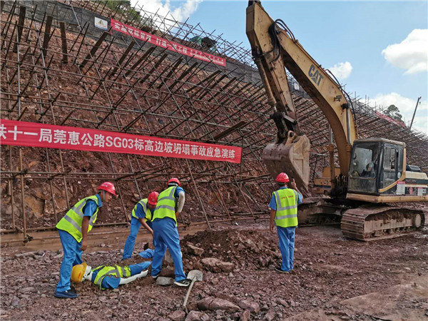 6月20日,中鐵十一局二公司莞惠公路樟謝段SG03標(biāo)項(xiàng)目經(jīng)理部,以《高邊坡塌方事故應(yīng)急救援預(yù)案》為依據(jù),本著“貼近實(shí)戰(zhàn)、周密組織、突出重點(diǎn)、注重實(shí)效”的原則,通過實(shí)際演習(xí),檢驗(yàn)應(yīng)急指揮機(jī)制、預(yù)案及相關(guān)措施,鍛煉救援隊(duì)伍,提高莞惠公路SG03標(biāo)項(xiàng)目經(jīng)理部處理工程建設(shè)事故的整體水平和應(yīng)急搶險(xiǎn)的能力為目的,開展了高邊坡坍塌事故應(yīng)急演練。