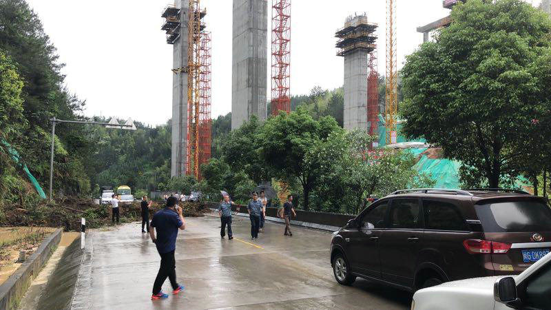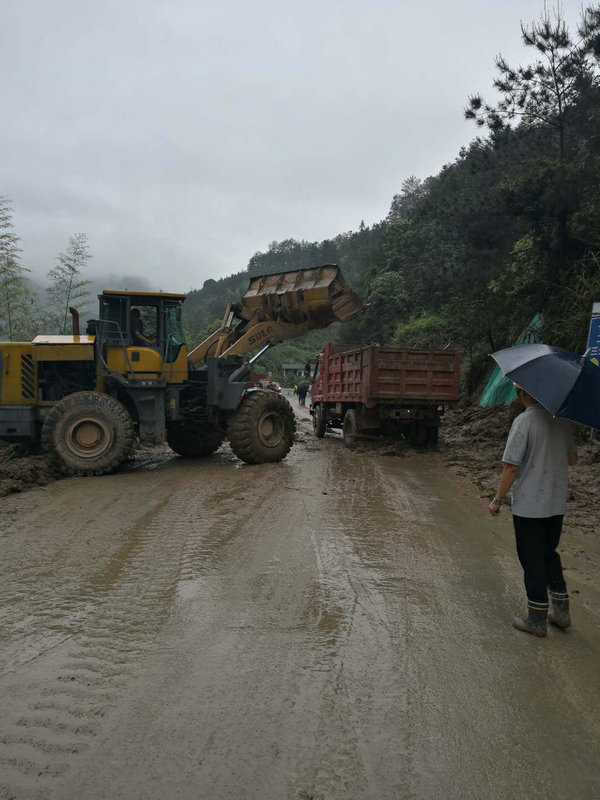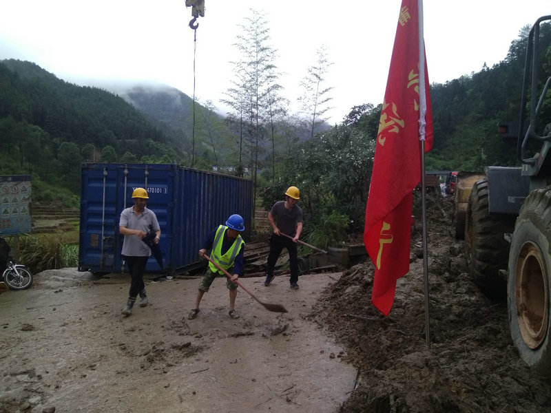 下午14時(shí),306省道發(fā)生二次泥石流山體塌方事故,沿線大大小小共計(jì)10處道路邊坡滑坡,造成堵塞交通。項(xiàng)目再次出動(dòng),緊急組織26名抗洪搶險(xiǎn)突擊隊(duì)成員、2臺(tái)鏟車(chē)、1臺(tái)挖機(jī)、5臺(tái)自卸車(chē)、1臺(tái)灑水車(chē)、立即趕往事故發(fā)生地進(jìn)行搶修,三明市廣平鎮(zhèn)政府、派出所、大田管理處、YJ5總監(jiān)辦監(jiān)理相關(guān)領(lǐng)導(dǎo)聞?dòng)嵑蠹皶r(shí)趕到現(xiàn)場(chǎng),參與到抗洪搶險(xiǎn)的隊(duì)伍中。此時(shí),狂風(fēng)暴雨,電閃雷鳴,現(xiàn)場(chǎng)搶險(xiǎn)工人沒(méi)有一個(gè)人退縮,干勁十足么,但雨量大,來(lái)速快,洪水來(lái)勢(shì)兇猛,一輛挖掘機(jī)正在處理堵塞道路時(shí),山體再次垮塌,泥石流一涌而下,司機(jī)師傅迅速做出反應(yīng),跳下操作駕駛位,但巨大的沖擊力將挖掘機(jī)沖到道路對(duì)面山溝下,險(xiǎn)釀成人員傷亡事故。此時(shí),如果不迅速清理堵塞,將邊坡加固,那么危險(xiǎn)將隨時(shí)可能發(fā)生,廣平鎮(zhèn)政府搶險(xiǎn)工作組與項(xiàng)目部研究后決定集中人力物力深入抗洪救災(zāi),快速完成搶險(xiǎn)工作,項(xiàng)目增加19名突擊隊(duì)隊(duì)員、2臺(tái)鏟車(chē)、6臺(tái)自卸車(chē)、1臺(tái)灑水車(chē)、1臺(tái)180噸吊車(chē),聯(lián)合地方救援力量,爭(zhēng)分奪秒,冒雨奮戰(zhàn)了近6個(gè)小時(shí),終于完成了清理道路、加固邊坡堤身的搶險(xiǎn)任務(wù),及時(shí)化解險(xiǎn)情,恢復(fù)現(xiàn)場(chǎng)道路交通。