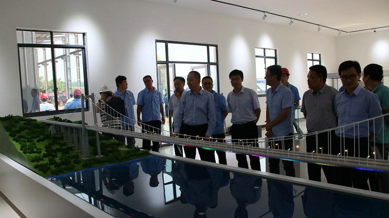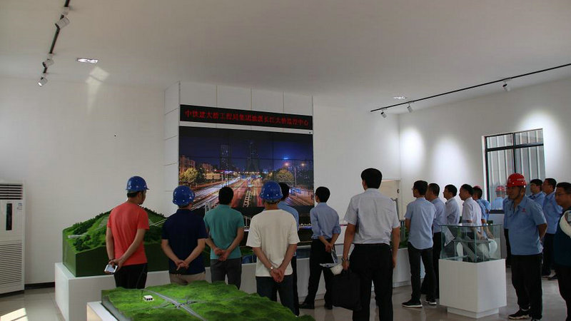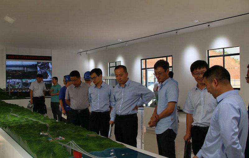 調(diào)研組首先參觀了合璧津五標(biāo)的科技創(chuàng)新工作室兼油溪長(zhǎng)江大橋安全監(jiān)控中心。在工作室內(nèi),油溪長(zhǎng)江大橋全息幻影成像和錨碇單體模型等智能化應(yīng)用展示引起了調(diào)研組的興趣。通過(guò)圖文并茂的功能展示,結(jié)合油溪長(zhǎng)江大橋和整體線路的沙盤(pán)模型,調(diào)研組對(duì)合璧津高速項(xiàng)目的整體施工布局和總體施工規(guī)劃有了直觀的認(rèn)知;監(jiān)控大屏播放的施工動(dòng)畫(huà),詳細(xì)講解了油溪長(zhǎng)江大橋的施工重難點(diǎn)、標(biāo)準(zhǔn)化規(guī)劃建設(shè)及具體的施工方案,結(jié)合科技創(chuàng)新工作室沙盤(pán)模型等規(guī)劃設(shè)計(jì)的直觀展示,調(diào)研人員對(duì)合璧津高速公路項(xiàng)目有了清晰的了解,對(duì)安全監(jiān)控中心可以實(shí)時(shí)監(jiān)控現(xiàn)場(chǎng)施工,時(shí)時(shí)為安全施工保駕護(hù)航的作用表示了贊嘆。