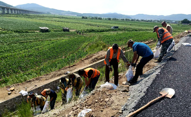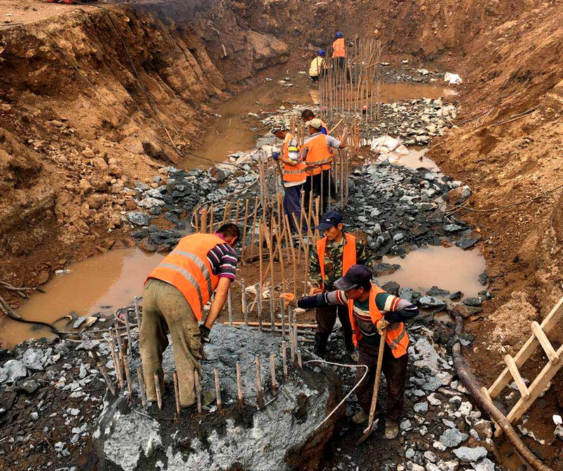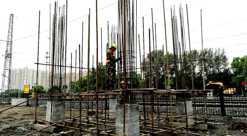 “咣當、咣當…”有節(jié)奏的鉆機轟鳴聲由遠及近,濱綏線K128立交橋工地,工人們冒雨用砂袋對11號樁基進行防護,并清理河道淤泥,防止雨水倒灌。一字排開的5臺鉆機晝夜不停搶進度。共產(chǎn)黨員、副經(jīng)理宮海濤欣喜地告訴筆者,目前5根樁基分別進尺19.8米至16.9米不等,按期完成沒有問題。