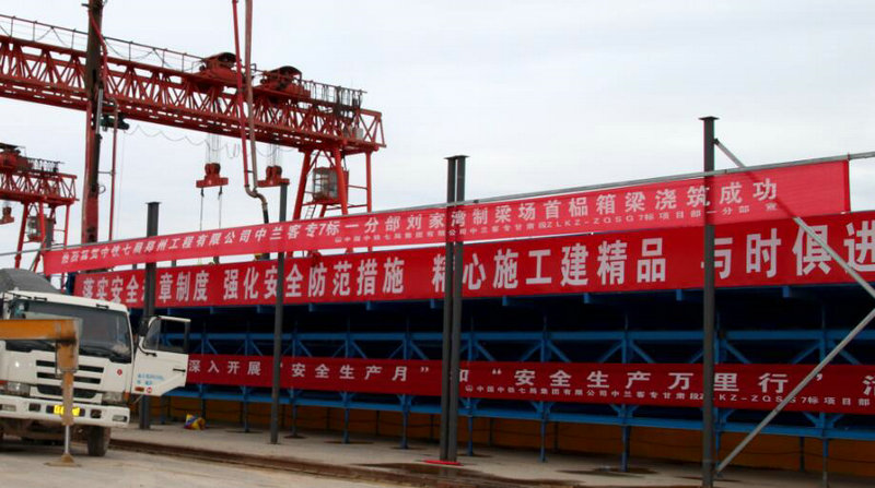 劉家灣制梁場位于永登縣劉家灣村,占地面積為166畝,肩負(fù)著中蘭客專6標(biāo)、7標(biāo)所有的預(yù)制箱梁任務(wù),共計463榀預(yù)制箱梁。梁場設(shè)置8個制梁臺座,配備2臺HZS120m3/h混凝土拌和站。自去年9月項目部進(jìn)場以來,由于劉家灣制梁場征地難度大、土建施工數(shù)量大、現(xiàn)場土質(zhì)疏松、氣候寒冷,全體員工不等不靠,在班子成員帶領(lǐng)下克服了征拆困難、惡劣天氣等外部不利環(huán)境,始終堅持高起點開局、高效率推進(jìn)、高質(zhì)量生產(chǎn)、高標(biāo)準(zhǔn)管理的理念,時刻以“工廠化、標(biāo)準(zhǔn)化、機械化、信息化”為建設(shè)標(biāo)準(zhǔn),先后一次性通過業(yè)主對拌和站、試驗室驗收及梁場整體驗收,為首梁預(yù)制創(chuàng)造了有利條件。