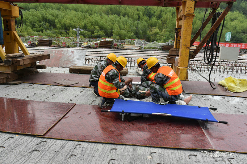 本次演練事故事是由攔魚河5#橋橋面上的架橋機電纜老化,引起配電箱著火造成電器火災,現場發(fā)現著火點的人員呼救,另一名施工人員在橋梁施工,由于情況緊急驚慌失措不慎從架橋機上掉到橋面。根據事故情況,項目部啟動專項應急預案,根據專項應急預案,本次有7個小組參與實施救援,救援分6個步驟進行,每個小組人員都已最快的速度抵達現場,并進行施救,整個演練過程有條不紊推進,受傷人員在最短的時間內送往醫(yī)院進行治療,未有生命安全。