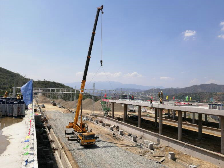 攀枝花南站作為成昆鐵路米攀段第一大站,有48組雨棚合架橫梁,存在站前施工單位雨棚基礎澆筑緩慢,橫梁生產(chǎn)周期長,施工難度大等困難,但節(jié)點工期迫在眉睫,為保證節(jié)點,項目部積極營造“施工空間”、落實責任、全面協(xié)調(diào)“見縫插針、找縫插針、鑿縫插針”。通過測量人員的精確測量、技術人員的準確計算、施工人員的精準控制,以及合理的施工組織,攀枝花南站首組硬橫梁架設一步到位,各項安裝工藝及效果均符合標準要求。