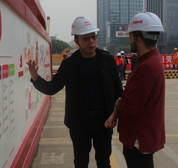 項目黨工委書記萬子兵(左)向新華社廣東分社外國記者介紹黨建實踐基地情況