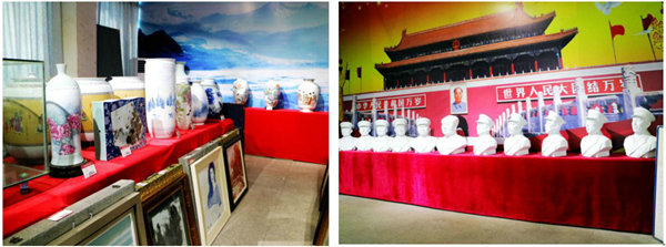 出了接待間,在展廳的進門位置,一尊毛澤東塑像擺在迎門處,十大元帥塑像分列兩邊,天安門城樓背景映襯之后。鐵道兵戰(zhàn)友的各種酒、紫砂壺、瓷器、繪畫、書法等產(chǎn)品分列在各個展柜、墻壁和展臺,真是琳瑯滿目,欣賞無暇??恐髽I(yè)的支撐和個人的初心守望,“四方老鐵文化園”從2017年8月生存至今,展品不斷豐富。