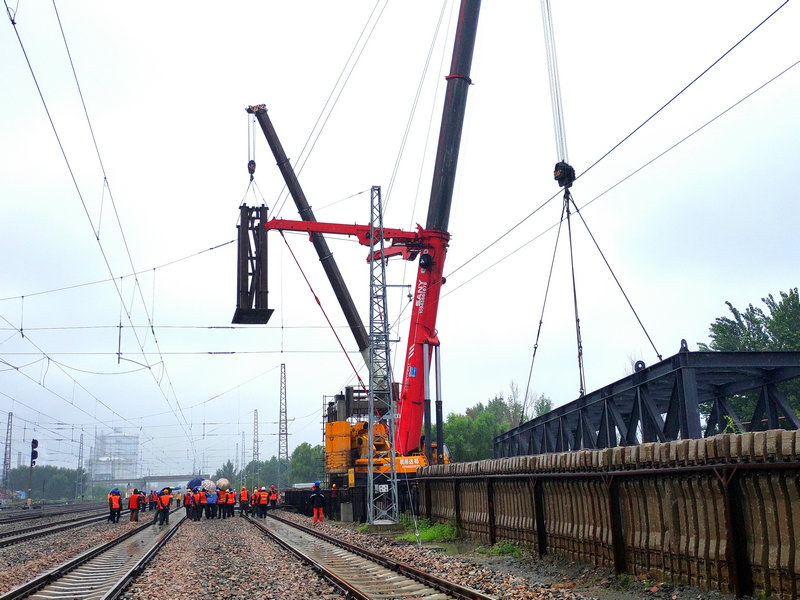 8月8日12時(shí)50分,經(jīng)過(guò)160分鐘的連續(xù)奮戰(zhàn),長(zhǎng) 44.05米、重98.5噸的鋼珩梁,跨越7條鐵路既有線、5條電力機(jī)車接觸網(wǎng)穩(wěn)穩(wěn)落在鋼結(jié)構(gòu)支座上,至此哈牡電氣化鐵路改造工程濱綏線K40+580人行天橋架梁順利告捷。此舉創(chuàng)造哈爾濱鐵路局集團(tuán)有限公司跨越電力機(jī)車接觸網(wǎng)架設(shè)鋼珩梁施工的“三項(xiàng)之最”,即跨線最多、梁體最重、難度最大。