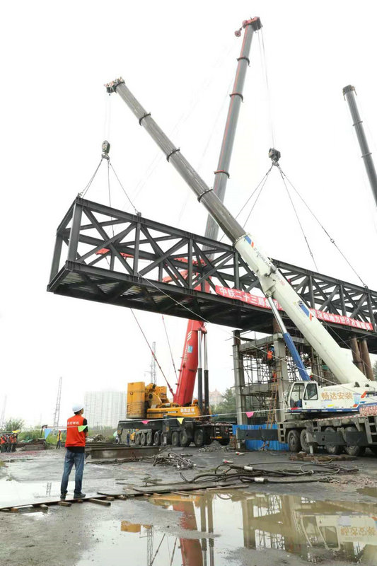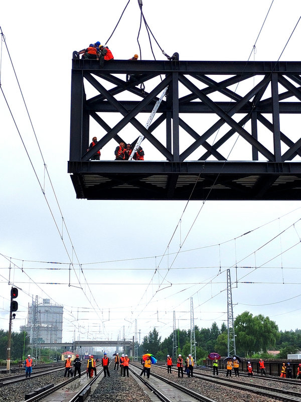 承擔(dān)施工任務(wù)的中鐵二十三局集團(tuán)哈牡項(xiàng)目部,在鐵路三級(jí)轉(zhuǎn)二級(jí)連續(xù)160分鐘的封鎖施工中,克服了跨越既有線和接觸網(wǎng)作業(yè)安全風(fēng)險(xiǎn)高、吊裝跨度大、作業(yè)面狹窄等重重困難,與中國(guó)鐵路哈爾濱局集團(tuán)有關(guān)運(yùn)輸站段緊密配合,先后召開(kāi)三次施工例會(huì),對(duì)施工方案進(jìn)行了認(rèn)真研究和科學(xué)優(yōu)化,調(diào)集了600噸、500噸和350噸全地面起重機(jī)各一臺(tái)。提前進(jìn)行了吊車站位,地基承載力和鋼結(jié)構(gòu)探傷試驗(yàn),制定了嚴(yán)密的架梁專項(xiàng)施工方案、作業(yè)流程圖和應(yīng)急預(yù)案。對(duì)各工序及作業(yè)環(huán)節(jié)進(jìn)行定人、定崗、定責(zé),對(duì)施工技術(shù)標(biāo)準(zhǔn)和安全質(zhì)量進(jìn)行詳細(xì)交底。參戰(zhàn)人員各盡其責(zé),嚴(yán)格執(zhí)行營(yíng)業(yè)線施工、安全管理規(guī)定,確保了人行天橋吊裝施工的順利完成。為下步人行梯道、圍護(hù)結(jié)構(gòu)及附屬工程施工創(chuàng)造了條件。施工單位將急百姓所急,加大組織和投入力度,爭(zhēng)分奪秒搶抓工期,力爭(zhēng)早日竣工,解除居民出入的繞行之苦。