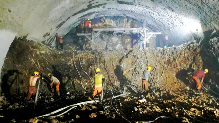 該隧道2月26日開工以來,按設計要求,采用雙側壁作業(yè)法,看似大大減少和避免塌方幾率,實則雙側壁導洞由于工作斷面狹窄,機械化作業(yè)受限,并受到施工安全步距要求,導致開挖、出碴及運送材料機械只能正進倒出,工效極低,進度緩慢,安全管理風險較大。為改變這一現(xiàn)狀,項目部多次與業(yè)主、設計單位進行方案溝通、論證。施工方案變?yōu)槿_階預留核心土開挖。由大挖掘機開挖,小挖機修邊,及時進行鋼拱架支護和錨噴作業(yè),較大地提高了工效,降低了安全風險。至7月下旬進入較硬圍巖,挖機炮錘開挖也極困難,于8月初啟動爆破開挖作業(yè),一排炮可進尺2米。