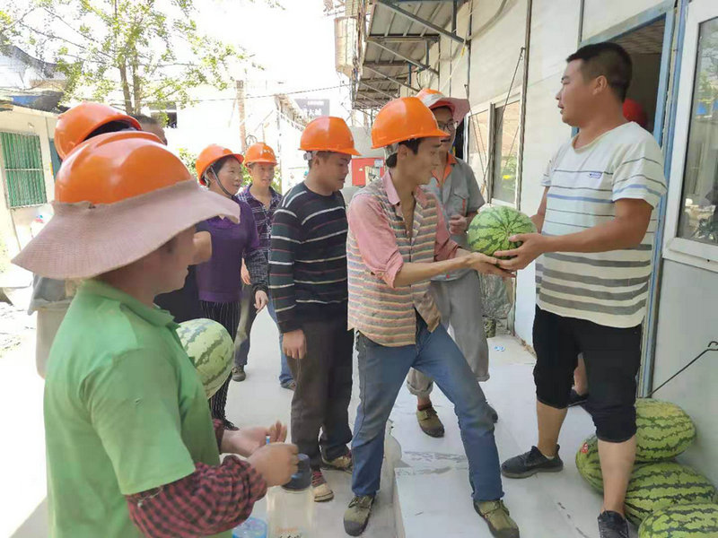 接到項目部送來的西瓜,農(nóng)民工們喜逐顏開