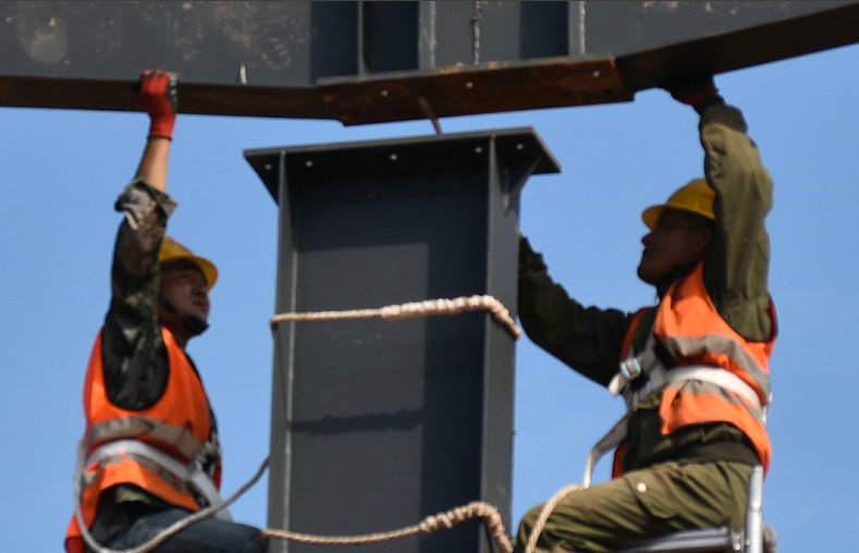 8月23日上午9時(shí)許,筆者來到正在安裝鋼筋加工廠的廠房主架梁施工現(xiàn)場(chǎng),只見兩名工人在離地面約5米的高空熟練的矯正支架梁與立柱對(duì)接,對(duì)接到位以后迅速進(jìn)行螺栓連接。盡管悶熱的天氣高溫已經(jīng)達(dá)到30多攝氏度,為了防止擦傷皮膚,他們?nèi)匀灰┥虾窈竦墓ぱb,戴上安全帽,系上安全繩。既要忍受高溫的煎熬,又要注意自身安全。他們的吃苦精神讓我感動(dòng),敬佩之情油然而生。