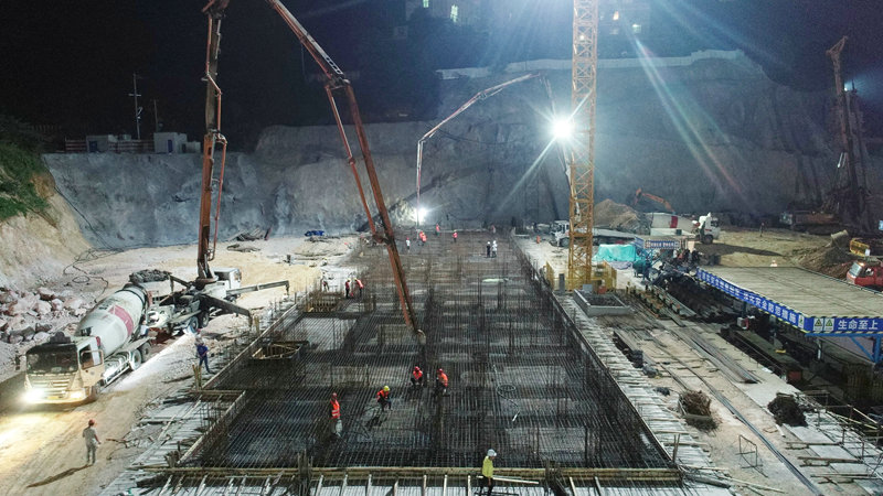 中鐵七局四公司按照銅仁市創(chuàng)建衛(wèi)生城市要求,針對(duì)現(xiàn)場(chǎng)情況編制了《混凝土連續(xù)澆筑保證措施方案》,采用兩臺(tái)混凝土輸送泵由兩端向中部同步推進(jìn)的方式進(jìn)行基礎(chǔ)底板混凝土澆筑施工。在施工過(guò)程中,四公司積極與當(dāng)?shù)亟还懿块T(mén)溝通協(xié)調(diào),確?;炷凉?yīng)道路暢通,施工作業(yè)有序開(kāi)展。