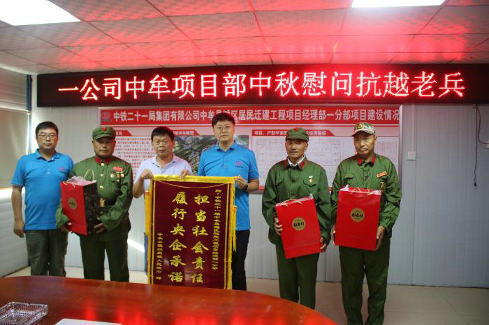 9月9日中秋節(jié)到來之際,中鐵二十一局集團一公司中牟房建項目部對幫扶的三名抗越老兵進行了慰問,鄭州市中牟縣狼城崗鎮(zhèn)特送來一面“履行央企承諾、擔當社會責任”的表揚錦旗,感謝項目部一直以來對抗越老兵的關(guān)心和幫助。