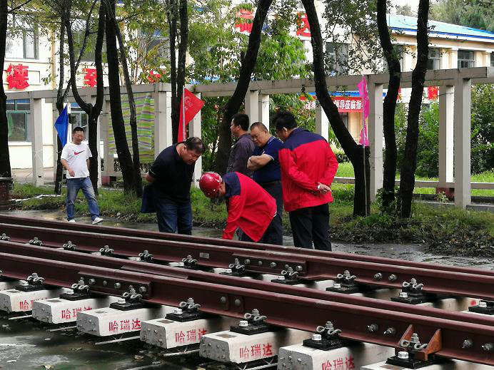 清晨,哈爾濱瑞達(dá)公司岔枕試鋪現(xiàn)場(chǎng)彩旗招展,一組鋪設(shè)完好的60Kg/m鋼軌9號(hào)單開地鐵道岔靜靜等待各位專家的驗(yàn)收。10時(shí)許,哈爾濱地鐵2號(hào)線的各參建方陸續(xù)到達(dá)的現(xiàn)場(chǎng),各位專家對(duì)試鋪完成的道岔進(jìn)行了詳細(xì)的檢驗(yàn),從產(chǎn)品的外觀到整體的適配性進(jìn)行了全面的驗(yàn)收。并參觀了哈爾濱瑞達(dá)公司的軌枕生產(chǎn)線及試驗(yàn)室。