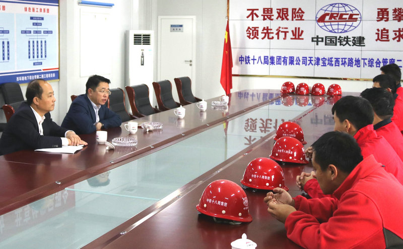 3、中鐵十八局集團(tuán)三公司副總經(jīng)理兼津冀管理部經(jīng)理王海偉(左二)、寶坻管廊項目經(jīng)理李賢松(左一)在現(xiàn)場辦公(周文婷 伍振 攝)
