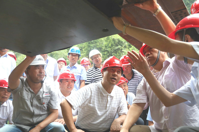 1、陜西省交通運(yùn)輸廳副廳長黨延兵、陜西省交通設(shè)計院副院長馬保林在中鐵十八局集團(tuán)二公司西鎮(zhèn)項目經(jīng)理周艇陪同下現(xiàn)場觀摩鋼梁支座安裝工藝(丁迪 攝)