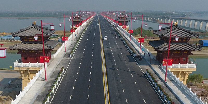 楚都大道位于湖北省荊州市紀南生態(tài)文化旅游區(qū),前后跨越南水北調引江濟漢渠和湖北省第三大湖海子湖,既是湖北省第二屆園林博覽會的重要進園通道,也是荊州中心城區(qū)與新建文旅區(qū)之間的重要連接通道。該道路全長4公里,呈南北走向。其重點控制性工程——跨海子湖特大橋建成后,成為荊州市新的地標建筑物和重要景點。海子湖特大橋全長1434米,寬34米,雙向六車道,設計時速50公里/小時,橋梁結構形式為十五跨一聯(lián)不等重變截面連續(xù)梁仿古景觀橋,主跨長度156米,是世界最長連續(xù)梁橋。