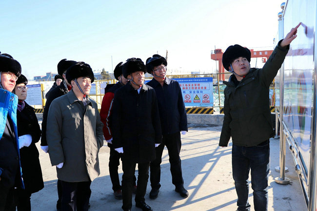 周松(右三)向副總指揮李福民(右一)一行匯報(bào)工程進(jìn)展情況。