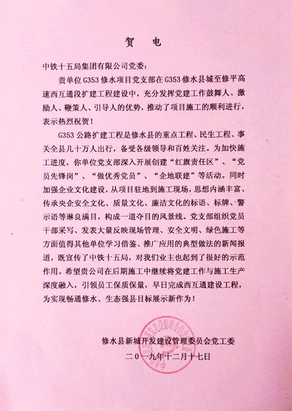 今年“七一”期間,項(xiàng)目書記接受了江西電視臺專訪。業(yè)主對項(xiàng)目黨支部發(fā)賀電表揚(yáng),在股份公司系統(tǒng)尚屬首例。