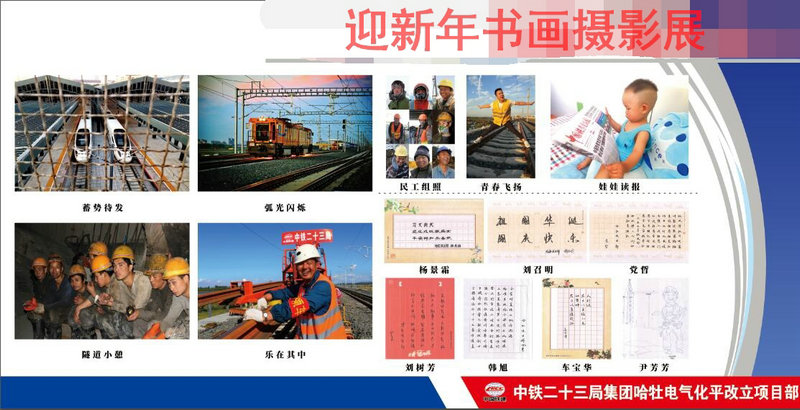 “一幅幅攝影作品定格在火熱的施工現(xiàn)場,一件件書法作品蒼勁有力、風(fēng)格迥異……”。元月5日結(jié)束的中鐵二十三局集團(tuán)二公司哈牡電氣化平改立項(xiàng)目部“迎新杯”書畫、攝影展,展現(xiàn)了蓬勃向上的項(xiàng)目特色文化,彰顯了員工的愛黨、愛國、愛企、愛崗熱情。