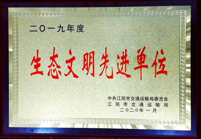 榮獲江蘇省江陰市2019年度“生態(tài)文明先進單位”