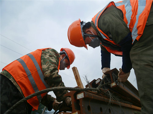 施工現(xiàn)場(chǎng),工人們對(duì)途卸的鋼軌安裝拖運(yùn)夾板