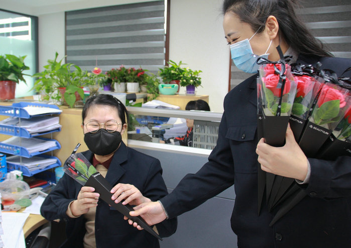 在分公司機關(guān),本著實際、節(jié)儉的原則,工會為在崗的36名女職工每人送上了一朵精致的仿真玫瑰花,贈花時向她們致以最誠摯的問候和衷心的祝福,女職工收到小禮物后,露出燦爛的笑容。紛紛表示,將通過更加努力的工作,回報企業(yè)的關(guān)愛。