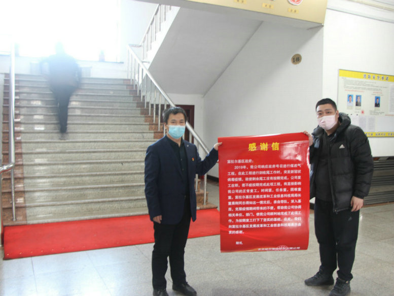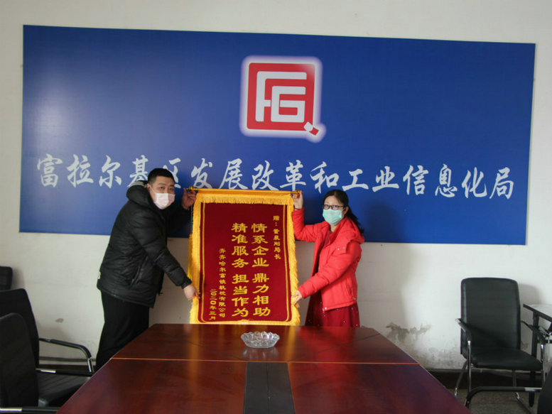 經(jīng)過幾天的緊張施工,順利地完成了此項工作,為軌枕公司按期復工打下了堅實的基礎。為了表達對富拉爾基區(qū)發(fā)改局的由衷感謝,公司領導研究決定向富拉爾基區(qū)政府遞送感謝信和向區(qū)發(fā)改局贈送錦旗,以感謝區(qū)政府部門的“情系企業(yè) 鼎力相助,精準服務 擔當作為”。