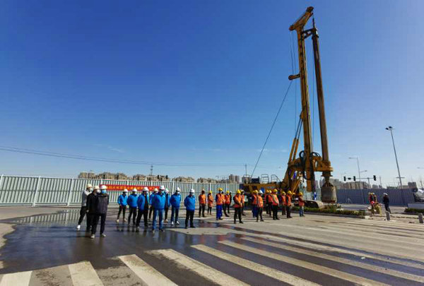 圖為:3月15日,滎陽(yáng)市滎澤大道上跨鄭西高鐵立交工程首顆鉆孔樁開(kāi)鉆現(xiàn)場(chǎng)。