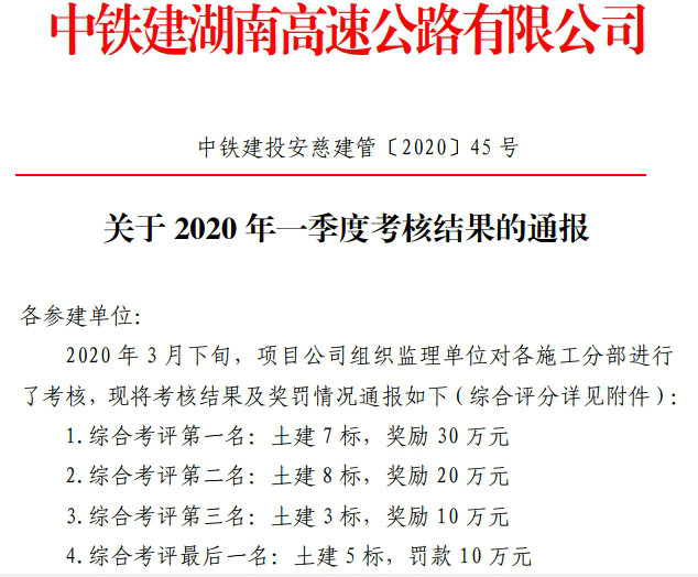 近期,中鐵建湖南高速公路有限公司(業(yè)主單位)開展了2020年一季度綜合考核,中鐵二十三局四公司安慈項目土建7標(biāo)在全線9個參建單位中脫穎而出,榮獲第一名。這也是該項目繼2019年三、四季度信用評價第一名、“大干60天”勞動競賽第一名及2019年度信用評價考核第一名(綜合得分:96.28,項目內(nèi)評價級別:AA)后再次蟬聯(lián)第一名,喜獲獎勵30萬元。