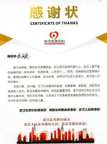 圖為程明蔚獻(xiàn)血感謝狀