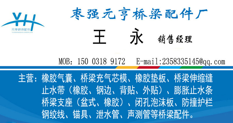 棗強(qiáng)元亨橋梁配件廠坐落于橡膠之鄉(xiāng)的河北衡水市,集研發(fā)、生產(chǎn)、銷(xiāo)售、咨詢(xún)和應(yīng)用服務(wù)于一體的專(zhuān)業(yè)生產(chǎn)多用途氣囊容器產(chǎn)品的獨(dú)資企業(yè)。我廠擁有專(zhuān)業(yè)技術(shù)人員和專(zhuān)業(yè)機(jī)械設(shè)備及專(zhuān)業(yè)焊工隊(duì)伍。 我廠以專(zhuān)業(yè)的隊(duì)伍、嚴(yán)謹(jǐn)?shù)墓芾?、超卓的設(shè)備,專(zhuān)業(yè)生產(chǎn)質(zhì)量一流的橋梁配件。主營(yíng):橡膠氣囊,工程橡膠充氣芯模,高壓氣囊,橋梁橡膠充氣芯模,市政管道封堵氣囊,A級(jí)全膠氣囊,帶法蘭盤(pán)橡膠氣囊,帶拉手純膠氣囊,高速公路鐵路梁板氣囊,混凝土襯托芯模,隧道涵洞氣囊,邊溝芯膜,箱涵芯模,閉水實(shí)驗(yàn)堵,閉氣試驗(yàn)堵,試驗(yàn)堵,橡膠護(hù)舷,封堵氣囊閉水堵,橡膠氣堵,充氣氣堵,充氣氣囊,橡膠氣囊布,排水管道堵水工具,管道用氣囊,橋梁板式支座,板式支座,橡膠膠板(厚度1mm-100mm),帶孔橡膠支座,橡膠止水帶,鋼邊止水帶,止水環(huán),止水條,接頭機(jī),止水帶膠水,橋梁支座,橋梁伸縮裝置,閉孔泡沫板,雙組份聚硫密封膠(膏),護(hù)欄支架,聲測(cè)管,泄水管,鋼絞線,錨具等橋梁配件。