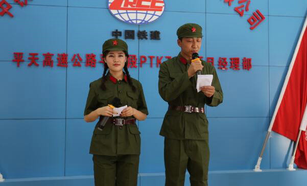 下午4時(shí),項(xiàng)目部會(huì)議室莊嚴(yán)肅穆。主持人張生晶、向前身著65式軍服,鮮紅的帽徽領(lǐng)章在綠軍裝的映襯下格外鮮艷奪目。當(dāng)她們用標(biāo)準(zhǔn)的普通話宣布三公司平天高速公路一標(biāo)項(xiàng)目部“講述鐵道兵故事,弘揚(yáng)鐵道兵精神”主題活動(dòng)暨紀(jì)念“八一”建軍節(jié)活動(dòng)隆重開幕時(shí),臺(tái)下響起了經(jīng)久不息的熱烈掌聲。