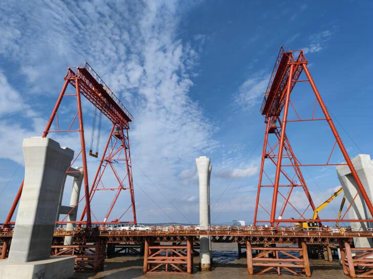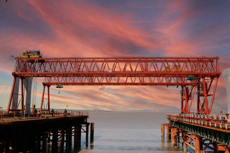 濱?;ネㄔO(shè)計(jì)142片鋼箱梁、299片疊合梁,單片重20—30噸、長20—60米,架設(shè)好的30片梁,一部分是通過公路從舟山梁場運(yùn)至現(xiàn)場,一部分是海上運(yùn)輸至石化區(qū)碼頭,轉(zhuǎn)運(yùn)至工地。由于梁體超長超寬,公路運(yùn)輸安全風(fēng)險(xiǎn)大,租賃石化區(qū)碼頭卸梁再轉(zhuǎn)運(yùn),費(fèi)時(shí)費(fèi)力,影響進(jìn)度。該項(xiàng)目部從安全、效率、成本等多方面考慮,決定在互通區(qū)建1座卸梁站、2座提梁站。前期經(jīng)過實(shí)地勘察,確定了卸梁站和2座提梁站位置,組織人員編制出實(shí)施方案,經(jīng)多方專家評(píng)審?fù)ㄟ^,報(bào)業(yè)主、鎮(zhèn)海區(qū)海事處審批后付諸實(shí)施。在聯(lián)系聯(lián)系廠家加工龍門吊的同時(shí),組織力量拆除區(qū)域內(nèi)的棧橋,深挖卸梁站航道內(nèi)的淤泥,克服多種困難,于7月13日建成36,4米高、16,8米寬的卸梁站。在兩座提梁站建設(shè)中,該項(xiàng)目部戰(zhàn)勝高溫、大風(fēng)大雨等極端天氣造成的困難,8月初建成1號(hào)提梁站并通過有關(guān)方面驗(yàn)收。在2號(hào)提梁站施工中,遭遇兩次強(qiáng)臺(tái)風(fēng),施工受阻,項(xiàng)目部采取科技公關(guān)、優(yōu)化資源等舉措,將臺(tái)風(fēng)造成的損失奪了回來,如期建成74米長、36米高、15米寬、負(fù)荷200噸的2號(hào)提梁站。兩座提梁站和1座卸梁站使用鋼材250余噸。