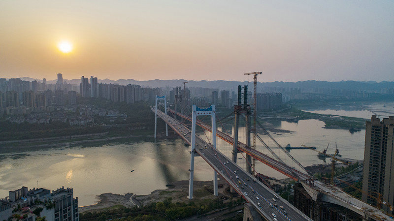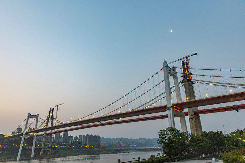 由中國鐵建投資集團(tuán)投資、中國鐵建大橋局施工的鵝公巖軌道專用橋是重慶軌道環(huán)線南環(huán)的控制性工程,鏈接長江九龍灘區(qū)東西兩岸。大橋全長1650.5米,施工中首創(chuàng)的“斜拉轉(zhuǎn)懸索”施工工藝,將世界自錨式懸索橋最大跨度最終定格在600米。