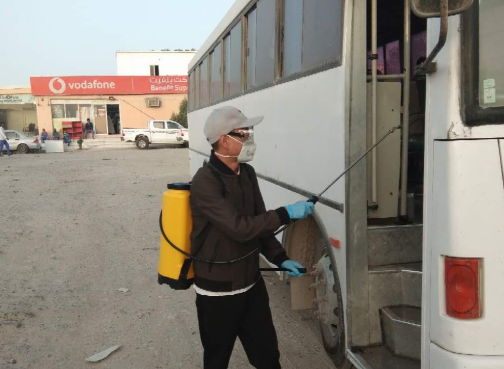 2、中鐵十八局集團卡塔爾分公司防疫人員對車輛進行消毒(楊國輝攝)