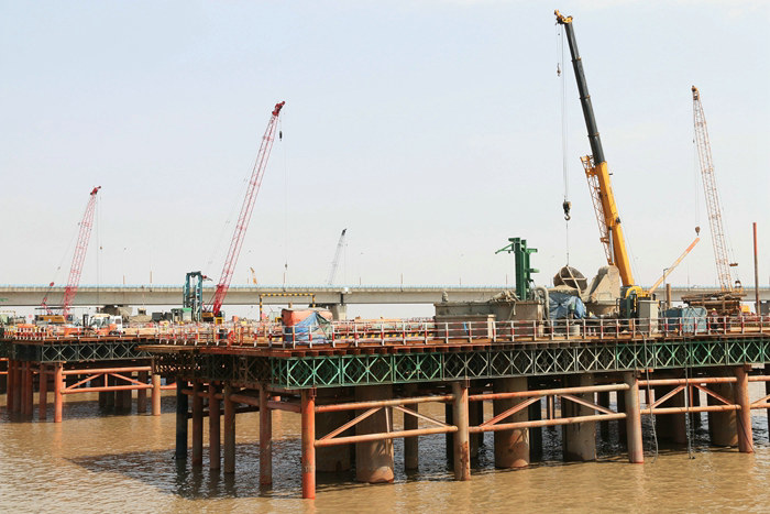 鋼棧橋領(lǐng)先一步,加速了鋼護(hù)筒插打、鉆機(jī)鉆孔、下鋼筋籠、灌注、承臺(tái)和墩身的施工進(jìn)程,最晚開工建設(shè)的H匝道鋼棧橋完成600米架設(shè)任務(wù),預(yù)計(jì)11月底將2000多米鋼棧橋清零。