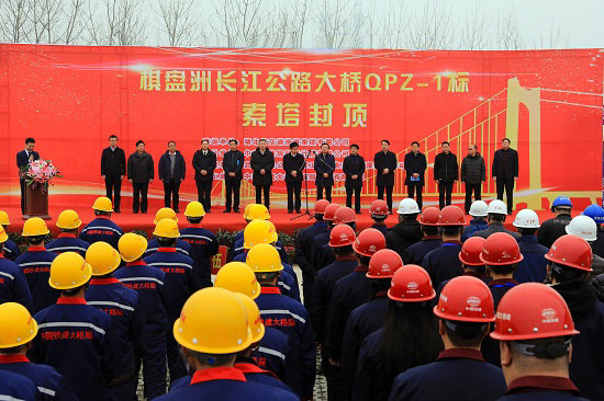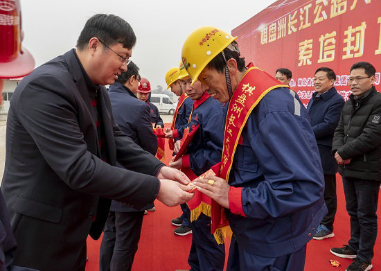 儀式上,蘄春縣人民政府副縣長李國忠致辭;湖北棋盤洲長江公路大橋有限公司副總經理、總工程師趙文藝致辭,中鐵建大橋工程局集團一公司執(zhí)行董事、黨委書記王學民致辭;蘄春縣政協主席蔡緒銀、湖北棋盤洲長江公路大橋有限公司副總經理汪應軍、中鐵建大橋工程局集團橋梁指揮部副指揮張耀為3名“最美工匠”頒獎;湖北棋盤洲長江公路大橋有限公司董事長、總經理汪西華宣布北索塔最后封頂。