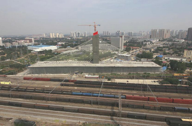 2、中鐵十八局集團(tuán)參建的保定樂(lè)凱大街南延工程轉(zhuǎn)體斜拉橋跨越京廣鐵路大動(dòng)脈等21條鐵路線(伍振 龍艷 攝)