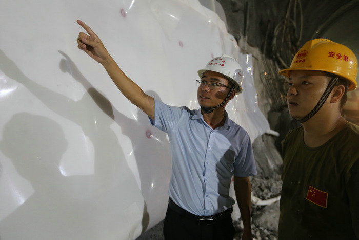 白秀山1#隧道進口,是余濤和二工區(qū)的重點工程。隧道掘進距洞口1313米時,突現兩個巨型溶洞,溶洞長27米、寬29米,延伸至右側邊墻以外十幾米,拱頂上方高達40多米,呈一個漏斗形,仰拱下方深不見底,有暗河流淌,用繩測深度80多米。